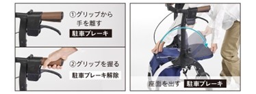 「グリップを離すと駐車ブレーキがかかる!新しい安全設計の歩行器」